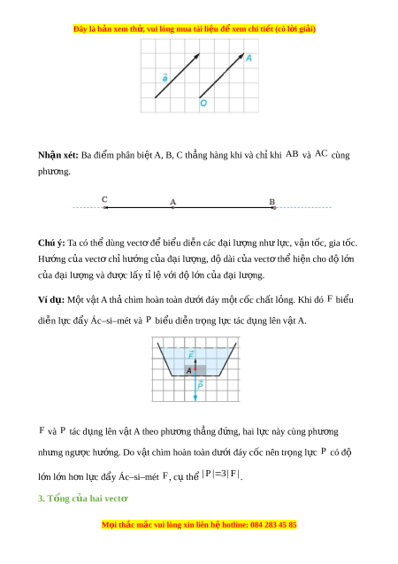 Chú ý: Ta có th dùng vect ể ơ đ bi ể u di ể n các ễ đ i ạ lư ng ợ nh l ư c, v ự n t ậ ốc, gia tốc. Hư ng ớ c a vect ủ ơ chỉ hư ng c ớ a ủ đ i ạ lư ng, đ ợ ộ dài c a vect ủ ơ th hi ể n cho đ ệ l ộ n ớ c a ủ đ i ạ lư ng ợ và đư c l ợ y t ấ l ỉ v ệ i ớ đ l ộ n c ớ a đ ủ i ạ lư ng. ợ Ví d : ụ M t ộ v t ậ A th chì ả m hoàn toàn dư i ớ đáy m t ộ c c ch ố t ấ l ng. K ỏ hi đó F bi u ể di n l ễ c ự đ y Á ẩ c–si–mét và P bi u di ể n t ễ r ng ọ l c t ự ác d ng l ụ ên v t ậ A. F và P tác d ng l ụ ên v t ậ A theo phư ng ơ th ng đ ẳ ng, hai ứ l c này cùng ph ự ư ng ơ