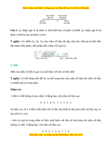 Ý nghĩa: Trung vị không bị nh ả hư ng ở b i ở giá trị b t ấ thư ng ờ trong khi s ố trung bình bị nh ả hư ng ở b i ở giá trị b t ấ thư ng. ờ Vì v y ậ , khi m u ẫ số li u ệ có giá trị b t ấ thư ng, ờ ngư i ờ ta thư ng dùng t ờ rung v đ ị i ạ di n cho ệ các s l ố i u t ệ h ng kê. ố 5. Tứ phân vị T phân v ứ ị dùng đ xác đ ể ịnh ngư ng ỡ đ phân l ể o i ạ các s l ố i u có t ệ rong m u s ẫ l ố i u. ệ Để tìm các t phân v ứ c ị a m ủ u s ẫ ố li u có n gi ệ á tr , t ị a làm như sau: + S p ắ x p m ế u s ẫ ố li u t ệ heo th t ứ không gi ự m ả . + Tìm trung v . G ị iá tr này l ị à Q2. + Tìm trung vị c a ủ n a ử số li u