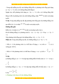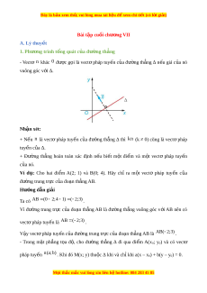 Đây là bản xem th , vu ử i lòng mua tài li u ệ đ xe ể m chi ti t ế (có l i ờ gi i ả ) Bài t p cu ậ i ố chư ng ơ VII A. Lý thuy t ế 1. Phư ng ơ trình t ng q ổ uát c a đ ủ ư ng t ờ h ng ẳ - Vectơ n khác 0 đư c ợ g i ọ là vectơ pháp tuy n ế c a ủ đư ng ờ th ng ẳ ∆ n u ế giá c a ủ nó vuông góc v i ớ ∆. Nhận xét: + N u ế n là vectơ pháp tuy n ế c a ủ đư ng ờ th ng