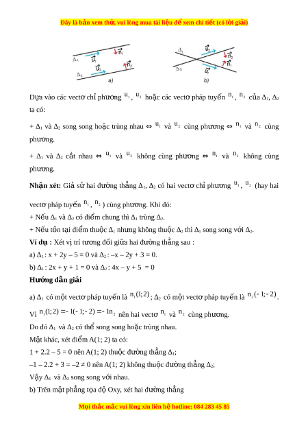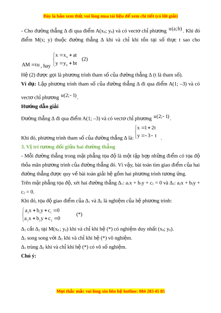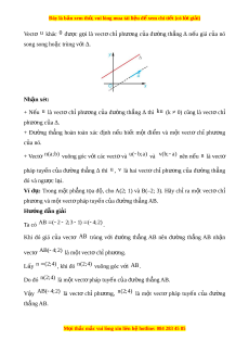 Đây là bản xem th , vu ử i lòng mua tài li u ệ đ xe ể m chi ti t ế (có l i ờ gi i ả ) Vectơ u khác 0 đư c ợ g i ọ là vectơ chỉ phư ng ơ c a ủ đư ng ờ th ng ẳ ∆ n u ế giá c a ủ nó song song ho c ặ trùng v i ớ ∆. Nhận xét: + N u ế u là vectơ chỉ phư ng ơ c a ủ đư ng ờ th ng