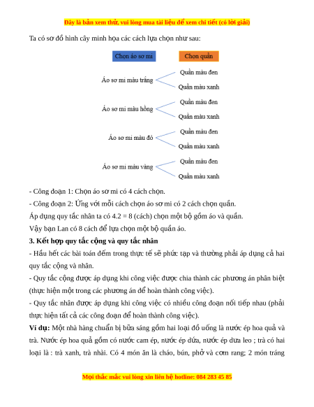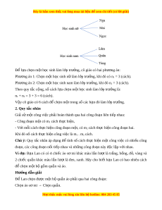 ơ ồ hình cây minh h a các ọ cách l a ự ch n nh ọ s ư au: - Công đo n ạ 1: Ch n áo ọ s m ơ i có 4 cách ch n. ọ - Công đo n ạ 2: ng v Ứ i ớ m i ỗ cách ch n áo s ọ m ơ i có 2 cách ch n qu ọ n. ầ Áp d ng ụ quy t c nhân t ắ a có 4.2 = 8 (cách) ch n ọ m t ộ b g ộ m ồ áo và qu n. ầ V y ậ b n L ạ an có 8 cách đ l ể a ch ự n ọ m t ộ b qu ộ n áo. ầ 3. K t ế h p quy t ợ c c ắ ng ộ và quy t c n ắ hân - H u ầ h t ế các bài toán đ m ế trong th c ự t ế s ẽ ph c ứ t p ạ và thư ng ờ ph i ả áp d ng ụ c ả hai quy t c ắ c ng và nhân. ộ - Quy t c ắ c ng ộ đư c ợ áp d ng ụ khi công vi c ệ đư c ợ chia thành các phư ng ơ án phân bi t ệ (th c hi ự n m ệ t ộ trong các phư ng án ơ đ hoàn t ể hành công vi c) ệ . - Quy t c ắ nhân đư c ợ áp d ng ụ khi công vi c ệ có nhi u ề công đo n ạ n i ố ti p ế nhau (ph i ả th c ự hi n t ệ ất cả các công đo n ạ đ hoàn t ể hành công vi c) ệ . Ví d : ụ M t ộ nhà hàng chu n ẩ b ịb a ữ sáng g m ồ hai lo i ạ đ ồ u ng ố là nư c ớ ép hoa quả và trà. Nư c ớ ép hoa qu ả g m ồ có nước cam ép, nư c ớ ép d a, ứ nư c ớ ép d a ư leo ; trà có hai lo i