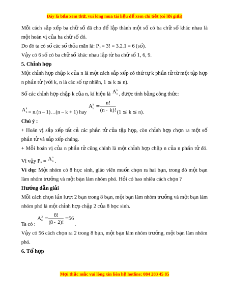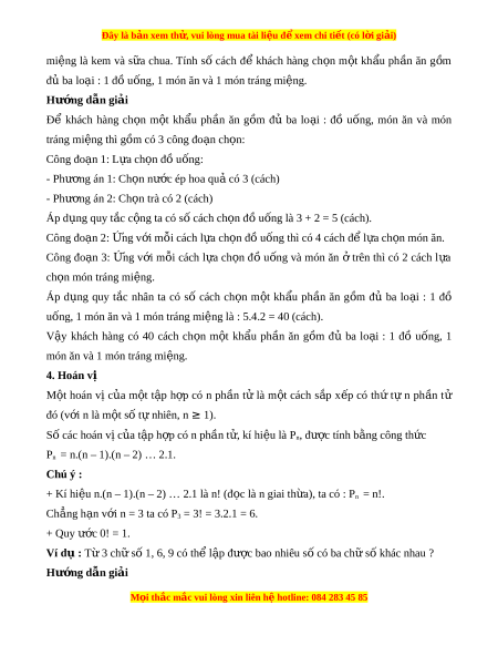 món ăn và 1 món tráng mi ng. ệ 4. Hoán vị M t ộ hoán vị c a ủ m t ộ t p ậ h p ợ có n ph n ầ tử là m t ộ cách s p ắ x p ế có th ứ t ự n ph n ầ tử đó (v i ớ n là m t ộ số t nhi ự ên, n ≥ 1). Số các hoán vị c a ủ t p h ậ p có ợ n ph n t ầ , kí ử hi u l ệ à Pn, đư c ợ tính b ng công t ằ h c ứ