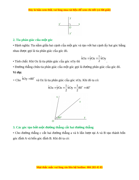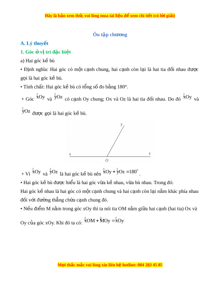 Đây là bản xem th , vu ử i lòng mua tài li u ệ đ xe ể m chi ti t (c ế ó l i ờ gi i ả ) Ôn tập chư ng ơ A. Lý thuy t ế 1. Góc ở v t ị rí đặc bi t ệ a) Hai góc kề bù • Đ nh ị nghĩa: Hai góc có m t ộ c nh ạ chung, hai c nh ạ còn l i ạ là hai tia đ i ố nhau đư c ợ g i ọ là hai góc k bù. ề