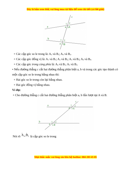 + Hai góc so le trong còn l i ạ b ng ằ nhau. + Hai góc đ ng v ồ b ị ng nhau. ằ Ví d : ụ + Cho đư ng t ờ h ng c ẳ c t ắ hai đư ng ờ th ng phân bi ẳ t ệ a, b l n l ầ ư t ợ t i ạ A và B. Nói rõ A ;B 4 2 là c p ặ góc so le trong M i