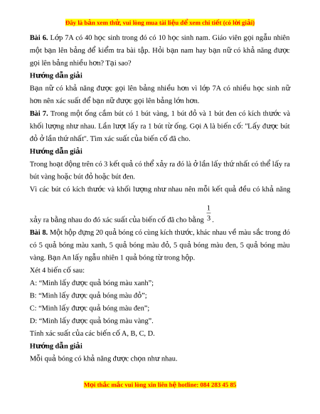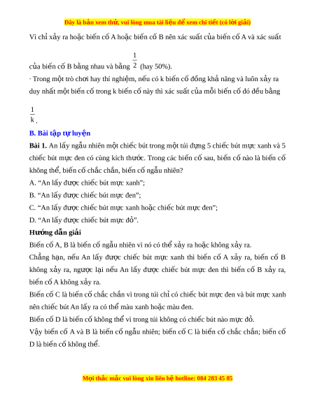 Đây là bản xem th , vu ử i lòng mua tài li u ệ đ xe ể m chi ti t (c ế ó l i ờ gi i ả ) Vì chỉ x y ả ra hoặc bi n c ế ố A ho c bi ặ n c ế ố B nên xác suất c a ủ bi n c ế ố A và xác su t ấ 1 c a ủ bi n c ế ố B b ng ằ nhau và b ng ằ 2 (hay 50%). ∙ Trong m t ộ trò ch i ơ hay thí nghi m ệ , n u có k bi ế n c ế đ ố ng kh ồ năng và l ả uôn x y ả ra duy nhất m t ộ bi n c ế ố trong k bi n ế c này ố thì xác su t ấ c a m ủ i ỗ bi n c ế đó đ ố u b ề ng ằ 1 k . B. Bài t p t ậ l ự uy n ệ Bài 1. An l y ấ ng u ẫ nhiên m t ộ chi c ế bút trong m t ộ túi đ ng ự 5 chi c ế bút m c ự xanh và 5 chi c ế bút m c