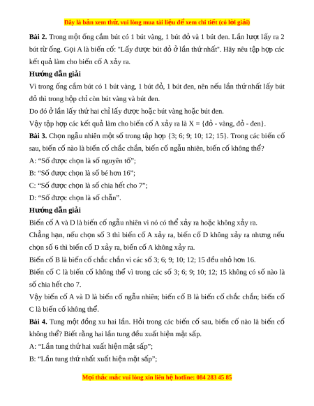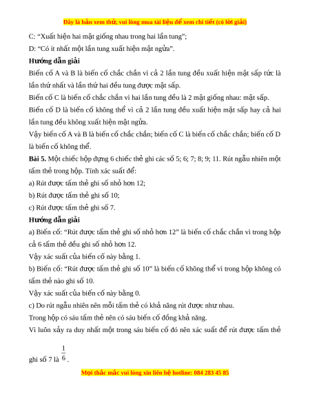 Đây là bản xem th , vu ử i lòng mua tài li u ệ đ xe ể m chi ti t (c ế ó l i ờ gi i ả ) C: “Xuất hi n hai ệ m t ặ gi ng nhau t ố rong hai l n t ầ ung”; D: “Có ít nh t ấ m t ộ l n t ầ ung xu t ấ hi n m ệ t ặ ng a”. ử Hư ng d ớ ẫn gi i ả Bi n ế cố A và B là bi n ế cố ch c ắ ch n ắ vì cả 2 l n ầ tung đ u ề xu t ấ hi n ệ m t ặ s p ấ t c ứ là lần th nh ứ