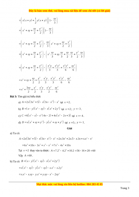Bài 3: Tìm giá trị biểu thức a) tại . b) tại ; . c) tại . d) tại ; . Giải a) Ta có: Tại thay vào ta được: Vậy . b) Ta có: