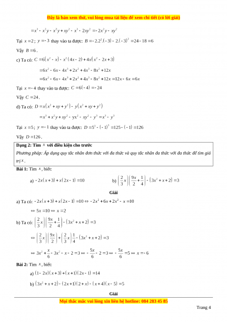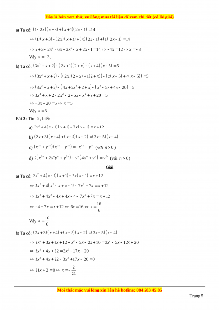 Phương pháp: Áp dụng quy tắc nhân đơn thức với đa thức và quy tắc nhân đa thức với đa thức để tìm giá trị . Bài 1: Tìm , biết: a) b) Giải a) Ta có: b) Ta có: Bài 2: Tìm , biết: a) b) Giải