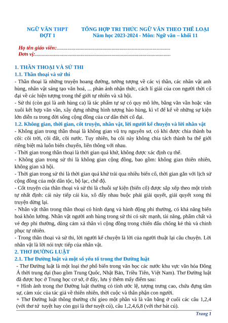 TỔNG HỢP TRI THỨC NGỮ VĂN THEO THỂ LOẠI ĐỢT 1