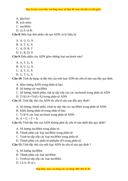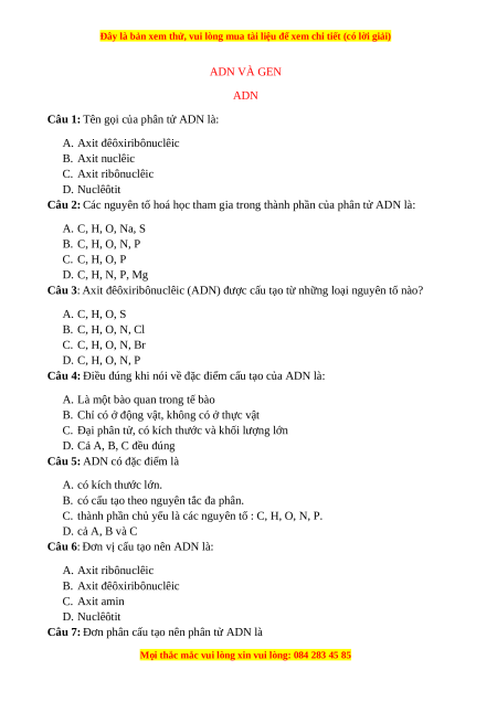 Câu 1: Tên gọi của phân tử ADN là: A. Axit đêôxiribônuclêic B. Axit nuclêic C. Axit ribônuclêic D. Nuclêôtit