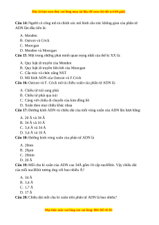 Câu 14: Người có công mô tả chính xác mô hình cấu trúc không gian của phân tử ADN lần đầu tiên là: A. Menđen B. Oatxon và Crick C. Moocgan D. Menđen và Moocgan