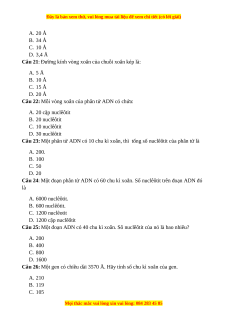 Câu 22: Mỗi vòng xoắn của phân tử ADN có chứa: A. 20 cặp nuclêôtit B. 20 nuclêôtit C. 10 nuclêôtit D. 30 nuclêôtit