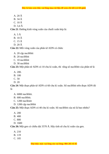 Câu 21: Đường kính vòng xoắn của chuỗi xoắn kép là: A. 5 Å B. 10 Å C. 15 Å D. 20 Å
