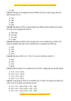 Câu 28: Một phân tử ADN có 200 nuclêôtit loại Ađênín, 800 nuclêôtit loại Guanin.