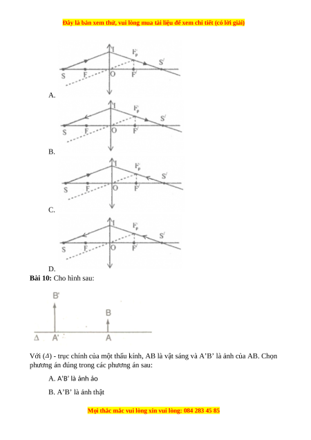 phương án đúng trong các phương án sau: A. A’B’ là ảnh ảo B. A’B’ là ảnh thật