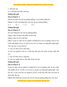 ể nào sau đây là đúng khi nói v i ớ nh ả c a ủ m t ộ v t ậ t o ạ b i ở gư ng ơ ph ng? ẳ A. nh c Ả a ủ m t ộ v t ậ t o ạ b i ở gư ng ph ơ ng ẳ luôn l n h ớ n v ơ t ậ . B. N u ế đ t ặ màn h ng ứ nh ả ở vị trí thích h p, ợ ta có thể h ng ứ đư c ợ nh ả c a ủ v t ậ t o ạ b i ở gư ng ph ơ ng. ẳ C. nh Ả c a ủ m t ộ v t ậ qua gư ng ơ ph ng ẳ có thể nhỏ h n ơ v t ậ , tùy thu c ộ vào vị trí c a ủ v t ậ trư c g ớ ư ng. ơ D. C ba phát ả bi u ể trên đ u s ề ai. Hư ng d ớ ẫn gi i ả Đáp án đúng là: D nh Ả c a ủ m t ộ v t ậ qua gư ng ơ ph ng ẳ là nh ả o, ả không h ng ứ đư c ợ trên màn, có kích thư c ớ b ng v ằ t ậ . Câu 2. Khi đ ng ứ trư c ớ gư ng ơ soi, n u ế ta gi ơ tay ph i ả lên thì nh ả c a ủ mình trong gư ng ơ l i ạ gi t ơ ay trái lên. T i ạ sao l i ạ nh v ư y? ậ A. Vì nh c ả a ủ v t ậ qua gư ng ơ cùng chi u v ề t ậ . B. Vì nh ả và v t ậ có kích thư c b ớ ng ằ nhau. C. Vì nh ả và v t ậ đ i ố x ng v ứ i ớ nhau qua gư ng. ơ D. Vì nh và ả v t ậ không th gi ể ng nhau v ố hì ề nh d ng và ạ kích thư c. ớ Hư ng d ớ ẫn gi i ả Đáp án đúng là: C Khi đ ng ứ trư c ớ gư ng ơ soi, n u ế ta gi ơ tay ph i ả lên thì nh ả c a ủ mình trong gư ng ơ l i ạ gi t ơ ay trái lên vì nh ả và v t ậ đ i ố x ng v ứ i ớ nhau qua gư ng. ơ Câu 3. Ch n ọ đáp án đúng? nh Ả em bé nhìn th y t ấ rong gư ng có đ ơ c đi ặ m ể gì? M i