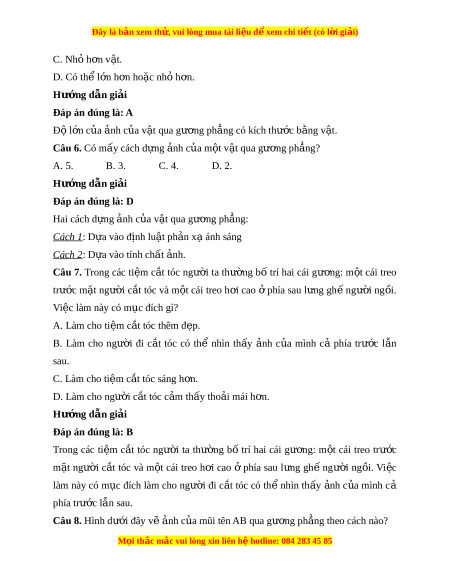 Câu 6. Có mấy cách d ng ự nh ả c a m ủ t ộ v t ậ qua gư ng ph ơ ng? ẳ A. 5. B. 3. C. 4. D. 2. Hư ng d ớ ẫn gi i ả Đáp án đúng là: D Hai cách d ng ự nh ả c a v ủ t ậ qua gư ng ph ơ ng: ẳ Cách 1: D a vào đ ự nh l ị u t ậ ph n ả x ánh ạ sáng Cách 2: D a vào t ự ính ch t ấ nh. ả Câu 7. Trong các ti m ệ c t ắ tóc ngư i ờ ta thư ng ờ b ố trí hai cái gư ng: ơ m t ộ cái treo trư c ớ m t ặ ngư i ờ c t ắ tóc và m t ộ cái treo h i ơ cao ở phía sau l ng ư gh ế ngư i ờ ng i ồ . Việc làm này có m c đí ụ ch gì? A. Làm cho ti m ệ c t ắ tóc thêm đ p. ẹ B. Làm cho ngư i ờ đi c t ắ tóc có thể nhìn th y ấ nh ả c a ủ mình cả phía trư c ớ l n ẫ sau. C. Làm cho ti m ệ c t ắ tóc sáng h n. ơ D. Làm cho ngư i ờ c t ắ tóc c m ả th y t ấ ho i ả mái h n. ơ Hư ng d ớ ẫn gi i ả Đáp án đúng là: B Trong các ti m ệ c t ắ tóc ngư i ờ ta thư ng ờ bố trí hai cái gư ng: ơ m t ộ cái treo trư c ớ m t ặ ngư i ờ c t ắ tóc và m t ộ cái treo h i ơ cao ở phía sau l ng ư gh ế ngư i ờ ng i ồ . Vi c ệ làm này có m c ụ đích làm cho ngư i ờ đi c t ắ tóc có th ể nhìn th y ấ nh ả c a ủ mình cả phía trư c l ớ ẫn sau. Câu 8. Hình dư i ớ đây v ẽ nh c ả a ủ mũi tên AB qua gư ng ơ ph ng t ẳ heo cách nào? M i