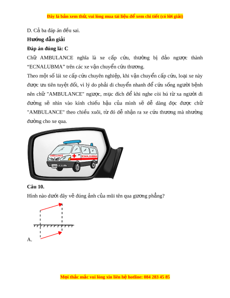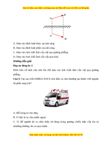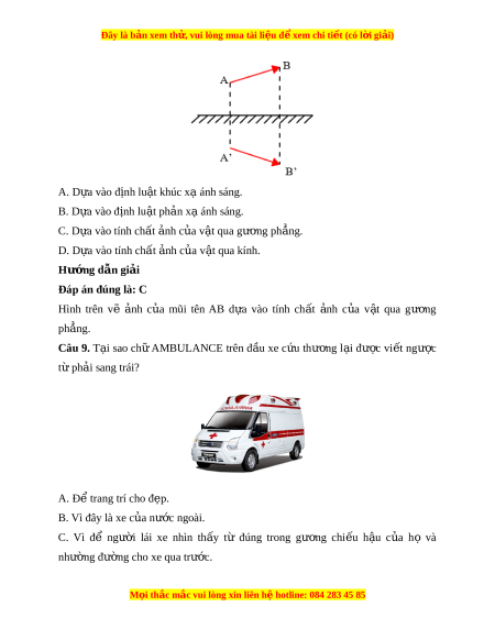 Đây là bản xem th , vu ử i lòng mua tài li u ệ đ xe ể m chi ti t (c ế ó l i ờ gi i ả ) A. D a ự vào đ nh l ị u t ậ khúc xạ ánh sáng. B. D a vào đ ự nh l ị u t ậ ph n ả x ánh ạ sáng. C. D a vào t ự ính ch t ấ nh c ả a ủ v t ậ qua gư ng ph ơ ng. ẳ D. D a ự vào tính ch t ấ nh c ả a ủ v t ậ qua kính. Hư ng d ớ ẫn gi i ả Đáp án đúng là: C Hình trên vẽ nh ả c a ủ mũi tên AB d a ự vào tính ch t ấ nh ả c a ủ v t ậ qua gư ng ơ ph ng. ẳ Câu 9. T i