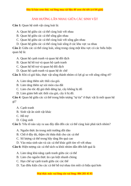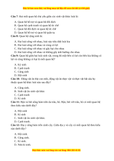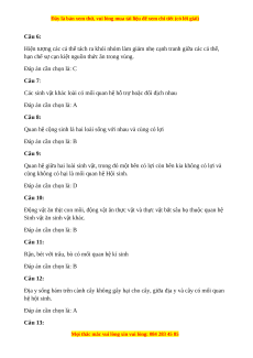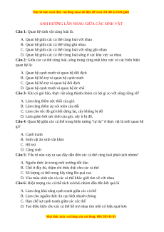 Các sinh vật khác loài có mối quan hệ hỗ trợ hoặc đối địch nhau Đáp án cần chọn là: A Câu 8: