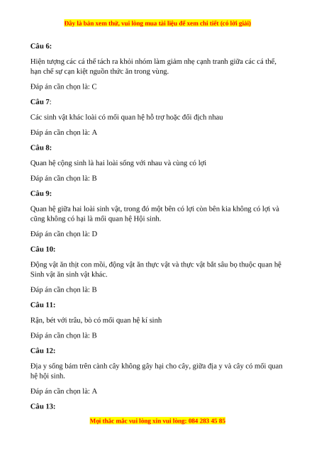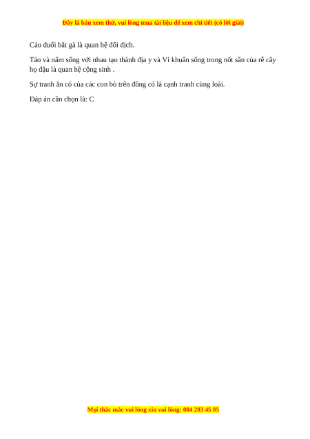 cũng không có hại là mối quan hệ Hội sinh. Đáp án cần chọn là: D Câu 10: