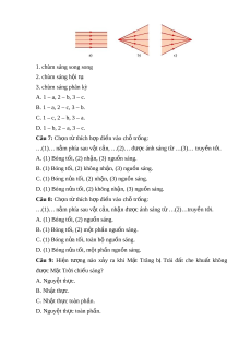 ọ tên các chùm sáng thư ng ờ g p ặ có trong hình sau b ng ằ cách ghép các c m ụ t v ừ i ớ hình tư ng ơ ng: ứ 1. chùm sáng song song 2. chùm sáng h i ộ tụ 3. chùm sáng phân kỳ A. 1 – a, 2 – b, 3 – c. B. 1 – a, 2 – c, 3 – b. C. 1 – c, 2 – b, 3 – a. D. 1 – b, 2 – a, 3 – c. Câu 7: Ch n ọ t t ừ hích h p đi ợ n vào ề ch t ỗ r ng ố : …(1)… n m ằ phía sau v t ậ c n, …( ả 2)… đư c ợ ánh sáng t … ừ (3)… truy n t ề i ớ . A. (1) Bóng tối, (2) nh n, ậ (3) ngu n s ồ áng. B. (1) Bóng t i ố , (2) không nh n, ậ (3) ngu n s ồ áng. C. (1) Bóng n a t ử ối, (2) nh n, ( ậ 3) ngu n s ồ áng. D. (1) Bóng n a ử tối, (2) không nh n, ậ (3) ngu n s ồ áng. Câu 8: Ch n ọ t t ừ hích h p đi ợ n vào ề ch t ỗ r ng ố : …(1)… n m ằ phía sau v t ậ c n, nh ả n ậ đư c ánh s ợ áng t …( ừ 2)…truy n t ề i ớ .