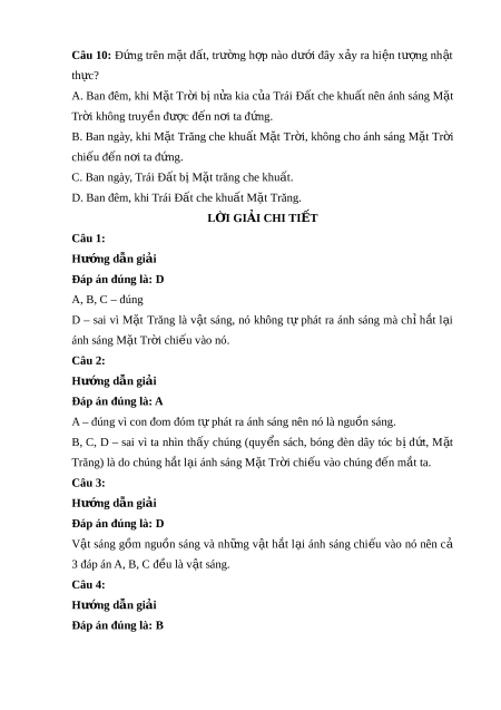 ể sách, bóng đèn dây tóc b ịđ t ứ , M t ặ Trăng) là do chúng h t ắ l i ạ ánh sáng M t ặ Tr i ờ chi u vào chúng đ ế n m ế t ắ ta. Câu 3: Hư ng ớ d n gi ẫ i ả Đáp án đúng là: D V t ậ sáng g m ồ ngu n ồ sáng và nh ng ữ v t ậ h t ắ l i ạ ánh sáng chi u ế vào nó nên cả 3 đáp án A, B, C đ u l ề à v t ậ sáng. Câu 4: Hư ng ớ d n gi ẫ i ả Đáp án đúng là: B Trong môi trư ng ờ trong su t ố và đ ng