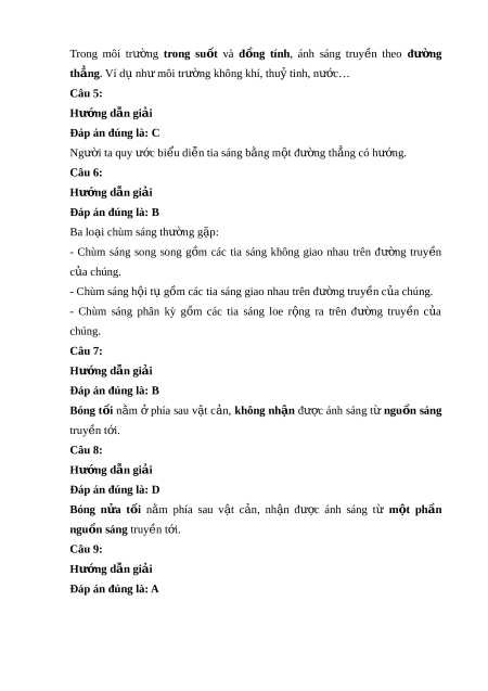 ồ tính, ánh sáng truy n ề theo đư ng ờ thẳng. Ví d nh ụ ư môi trư ng không khí ờ , thu t ỷ inh, nư c… ớ Câu 5: Hư ng ớ d n gi ẫ i ả Đáp án đúng là: C Ngư i ờ ta quy ư c ớ bi u di ể n t ễ ia sáng b ng m ằ t ộ đư ng ờ th ng có h ẳ ư ng. ớ Câu 6: Hư ng ớ d n gi ẫ i ả Đáp án đúng là: B Ba lo i ạ chùm sáng thư ng ờ g p: ặ - Chùm sáng song song g m