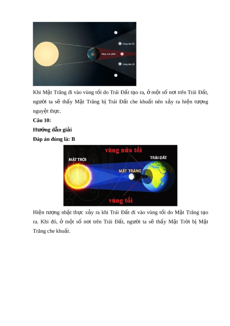 A. (1) Bóng tối, (2) ngu n s ồ áng. B. (1) Bóng t i ố , (2) m t ộ ph n ngu ầ n s ồ áng. C. (1) Bóng n a t ử ối, toàn b ngu ộ n s ồ áng. D. (1) Bóng n a ử tối, m t ộ ph n ngu ầ ồn sáng. Câu 9: Hi n ệ tư ng ợ nào x y ả ra khi M t ặ Trăng bị Trái đ t ấ che khu t ấ không đư c M ợ t ặ Tr i ờ chi u s ế áng? A. Nguyệt th c ự . B. Nh t ậ th c ự . C. Nh t ậ th c t ự oàn ph n ầ . D. Nguyệt th c t ự oàn ph n ầ . Câu 10: Đ ng ứ trên m t ặ đ t ấ , trư ng ờ h p ợ nào dư i ớ đây x y ả ra hi n ệ tư ng ợ nh t ậ th c? ự A. Ban đêm, khi M t ặ Tr i ờ bị n a ử kia c a ủ Trái Đ t ấ che khu t ấ nên ánh sáng M t ặ Tr i ờ không truy n ề đư c đ ợ n n ế i ơ ta đ ng ứ . B. Ban ngày, khi M t ặ Trăng che khu t ấ M t ặ Tr i