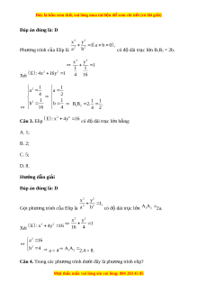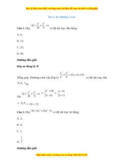 Đây là bản xem th , vu ử i lòng mua tài li u ệ đ xe ể m chi ti t ế (có l i ờ gi i ả ) Bài 6. Ba đư ng C ờ onic 2 2 x y E : 1 Câu 1. Elip 36 9 có độ dài tr c ụ l n b ớ ng: ằ A. 5; B. 12; C. 25; D. 50. Hư ng ớ d n gi ẫ i ả Đáp án đúng là: B 2 2 x y 1 a b 0 , 2 2 Tổng quát: Phư ng ơ trình c a ủ Elip là a b có độ dài tr c ụ l n ớ A A 1 2 2a. 2 2 2 x y a 3 6 a 6 E : 1 2 Xét 36 9 b 9 b 3 A A 1 2 = 2.6 = 12. Câu 2. Elip 2 2 E : 4x 16y 1 có đ dài ộ tr c ụ bé b ng: ằ A. 2; B. 4; C. 1; 1 . D. 2 Hư ng ớ d n gi ẫ i ả M i