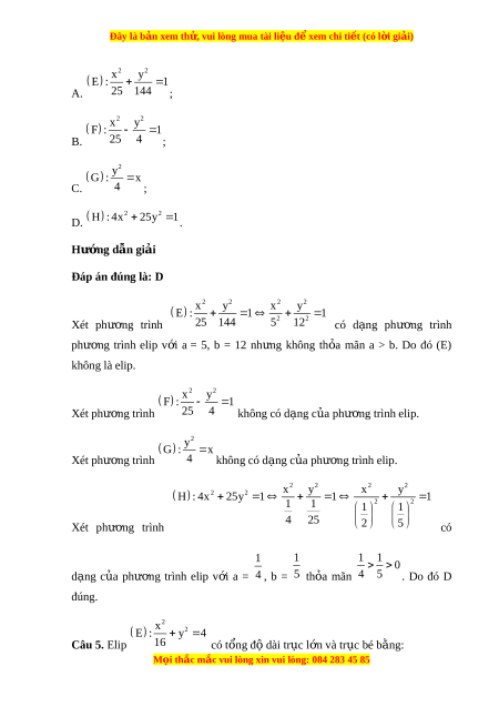 Đây là bản xem th , vu ử i lòng mua tài li u ệ đ xe ể m chi ti t ế (có l i ờ gi i ả ) 2 2 x y E : 1 A. 25 144 ; 2 2 x y F : 1 B. 25 4 ; 2 y G : x C. 4 ; D. 2 2 H : 4x 25y 1 . Hư ng ớ d n gi ẫ i ả Đáp án đúng là: D 2 2 2 2 x y x y E : 1 1 Xét phư ng ơ trình 2 2 25 144 5 12 có d ng ạ phư ng ơ trình phư ng ơ trình elip v i ớ a = 5, b = 12 nh ng ư không th a ỏ mãn a > b. Do đó (E) không là elip. 2 2 x y F : 1 Xét phư ng t ơ rình 25 4 không có d ng ạ c a ph ủ ư ng ơ trình elip. 2 y G : x Xét phư ng t ơ rình 4 không có d ng ạ c a ph ủ ư ng ơ trình elip. 2 2 2 2 x y x y H 2 2 : 4x 25y 1 1 1 2 2 1 1 1 1 4 25 Xét phư ng ơ trình 2 5 có 1 1 1 1 0 d ng ạ c a ủ phư ng ơ trình elip v i ớ a = 4 , b = 5 th a ỏ mãn 4 5 . Do đó D đúng. 2 x E 2 : y 4 Câu 5. Elip 16 có tổng đ dài ộ tr c ụ l n và t ớ r c bé b ụ ng: ằ M i