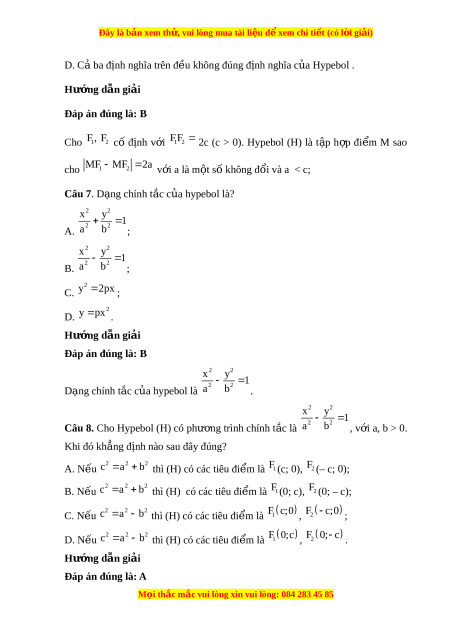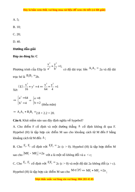 Đây là bản xem th , vu ử i lòng mua tài li u ệ đ xe ể m chi ti t (c ế ó l i ờ gi i ả ) A. 5; B. 10; C. 20; D. 40. Hư ng d ớ ẫn gi i ả Đáp án đúng là: C 2 2 x y 1 , Phư ng ơ trình c a ủ Elip là 2 2 a b có độ dài tr c ụ l n ớ A A 1 2 2a và độ dài tr c bé l ụ à B B 1 2 2b. 2 x 2 2 x y E 2 : y 4 1 Xét 16 64 4 2 a 64 a 8 2 b 4 b 2 (th a ỏ mãn) A A B B 1 2 1 2 2.8 + 2.2 = 20. Câu 6. Khái ni m ệ nào sau đây đ nh nghĩ ị a v hypebol ề ? A. Cho đi m ể F cố đ nh ị và m t ộ đư ng ờ th ng ẳ cố đ nh ị không đi qua F. Hypebol (H) là t p ậ h p ợ các đi m ể M sao cho kho ng ả cách từ M đ n ế F b n ằ g kho n ả g cách t ừ M đ n ế ; B. Cho F , F FF 1 2 cố đ nh ị v i