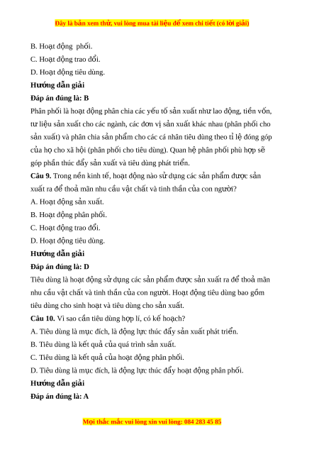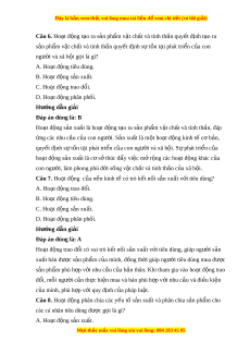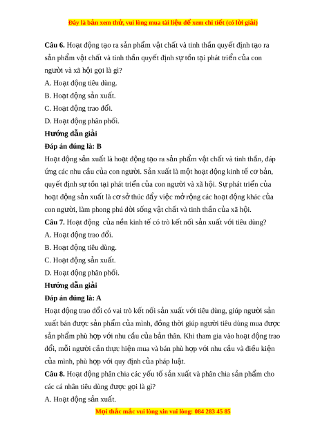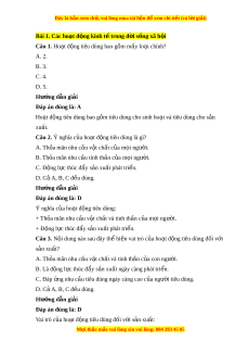 Đây là bản xem th , vu ử i lòng mua tài li u ệ đ xe ể m chi ti t ế (có l i ờ gi i ả ) Câu 6. Ho t ạ đ ng ộ t o r ạ a s n ả ph m ẩ v t ậ ch t ấ và tinh th n quy ầ t ế đ nh t ị o ạ ra s n ả ph m ẩ v t ậ ch t ấ và tinh th n quy ầ t ế đ nh s ị ự t n t ồ i ạ phát tri n c ể a ủ con ngư i ờ và xã h i ộ g i ọ là gì? A. Ho t ạ đ ng ộ tiêu dùng. B. Ho t ạ đ ng s ộ n ả xu t ấ . C. Ho t ạ đ ng t ộ rao đ i ổ . D. Ho t ạ đ ng ộ phân phối. Hư ng ớ d n gi ẫ i ả Đáp án đúng là: B Ho t ạ đ ng ộ s n ả xu t ấ là ho t ạ đ ng t ộ o r ạ a s n ph ả m ẩ v t ậ ch t ấ và tinh th n, đáp ầ ng các nhu c ứ ầu c a ủ con ngư i ờ . S n ả xu t ấ là m t ộ ho t ạ đ ng ki ộ nh t c ế ơ b n, ả quy t ế đ nh s ị t ự ồn t i ạ phát tri n c ể a con ủ ngư i ờ và xã h i ộ . S phát ự tri n c ể a ủ ho t ạ đ ng s ộ n xu ả ất là cơ s t ở húc đ y vi ẩ c m ệ r ở ng các ộ ho t ạ đ ng khác ộ c a ủ con ngư i ờ , làm phong phú đ i ờ sống v t ậ ch t ấ và tinh th n c ầ a xã h ủ i ộ . Câu 7. Ho t ạ đ ng ộ c a n ủ n ki ề nh t có ế trò k t ế n i ố s n ả xu t ấ v i ớ tiêu dùng? A. Ho t ạ đ ng ộ trao đ i ổ . B. Ho t ạ đ ng t ộ iêu dùng. C. Ho t ạ đ ng s ộ n ả xu t ấ . D. Ho t ạ đ ng ộ phân phối. Hư ng ớ d n gi ẫ i ả Đáp án đúng là: A Ho t ạ đ ng ộ trao đ i ổ có vai trò k t ế n i ố s n xu ả t ấ v i ớ tiêu dùng, giúp ngư i ờ s n ả xu t ấ bán đư c s ợ n ph ả m ẩ c a m ủ ình, đ ng t ồ h i ờ giúp ngư i ờ tiêu dùng mua đư c ợ s n ả ph m ẩ phù h p ợ v i ớ nhu c u c ầ a b ủ n