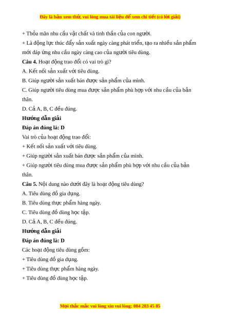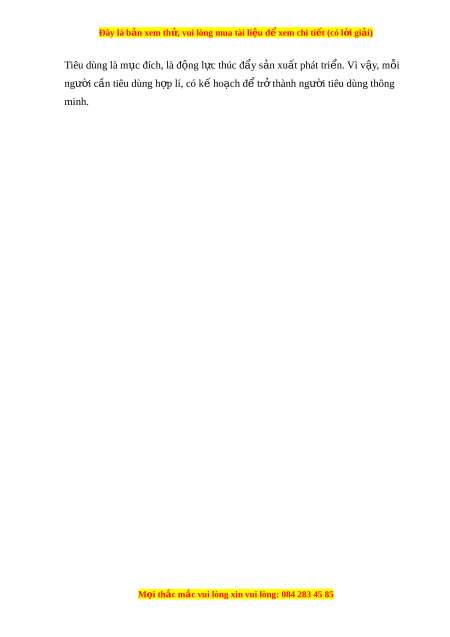 Đây là bản xem th , vu ử i lòng mua tài li u ệ đ xe ể m chi ti t (c ế ó l i ờ gi i ả ) + Th a ỏ mãn nhu c u v ầ t ậ ch t ấ và tinh th n c ầ a con ng ủ ư i ờ . + Là đ ng l ộ c t ự húc đ y s ẩ n xu ả t ấ ngày càng phát tri n, t ể o r ạ a nhi u s ề n ph ả m ẩ m i ớ đáp ng nhu c ứ u ngày càng cao c ầ a ủ ngư i ờ tiêu dùng. Câu 4. Ho t ạ đ ng t ộ rao đ i ổ có vai trò gì? A. K t ế nối s n xu ả t ấ v i ớ tiêu dùng. B. Giúp ngư i ờ s n xu ả t ấ bán đư c s ợ n ph ả m ẩ c a ủ mình. C. Giúp ngư i ờ tiêu dùng mua đư c ợ s n ả ph m ẩ phù h p ợ v i ớ nhu c u c ầ a b ủ n ả thân. D. C ả A, B, C đ u ề đúng. Hư ng d ớ ẫn gi i ả Đáp án đúng là: D Vai trò c a ủ ho t ạ đ ng ộ trao đ i ổ : + K t ế nối s n ả xu t ấ v i ớ tiêu dùng. + Giúp ngư i ờ s n ả xu t ấ bán đư c ợ s n ả ph m ẩ c a m ủ ình. + Giúp ngư i ờ tiêu dùng mua đư c s ợ n ph ả m ẩ phù h p v ợ i ớ nhu c u c ầ a ủ b n ả thân. Câu 5. N i ộ dung nào dư i ớ đây là ho t ạ đ ng t ộ iêu dùng? A. Tiêu dùng đ gi ồ a d ng. ụ B. Tiêu dùng th c ph ự m ẩ hàng ngày.