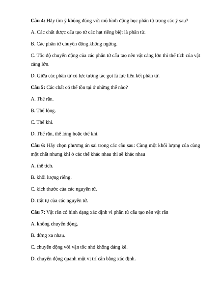 Câu 7: Vật rắn có hình dạng xác định vì phân tử cấu tạo nên vật rắn A. không chuyển động. B. đứng xa nhau.