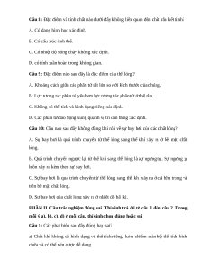 Câu 9: Đặc điểm nào sau đây là đặc điểm của thể lỏng?