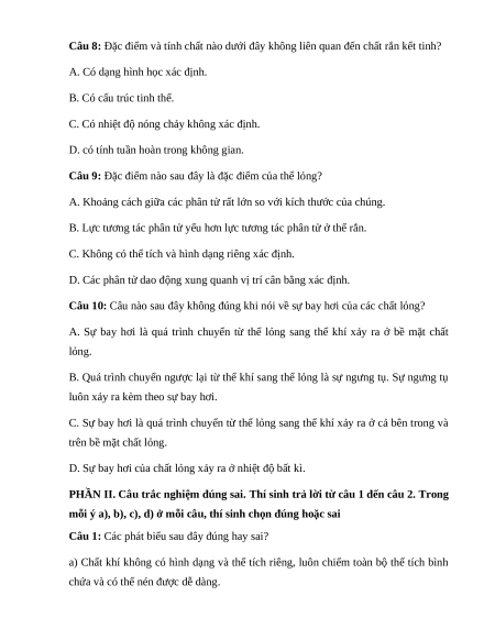 Trắc nghiệm Bài 1: Cấu trúc của chất. Sự chuyển thể Vật lí 12 Đúng-Sai, Trả lời ngắn Kết nối tri thức 2025