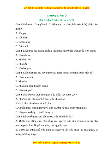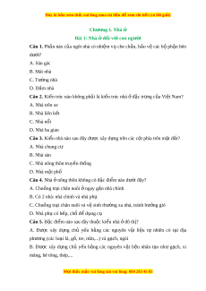 Đây là bản xem th , vu ử i lòng mua tài li u ệ đ xe ể m chi ti t ế (có l i ờ gi i ả ) Chư ng 1. N ơ hà ở Bài 1: Nhà ở đ i ố v i ớ con ngư i ờ Câu 1. Ph n ầ nào c a ủ ngôi nhà có nhi m ệ v ụ che ch n, ắ b o ả v ệ các b ộ ph n ậ bên dư i ớ ? A. Sàn gác B. Mái nhà C. Tư ng ờ nhà D. Dầm nhà Câu 2. Ki n t ế rúc nào không ph i ả là ki n t ế rúc nhà đ ở c t ặ r ng c ư a ủ Vi t ệ Nam? A. Nhà trên xe B. Nhà liên k t ế C. Nhà nổi D. Nhà ba gian