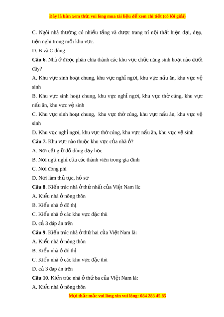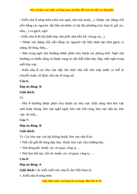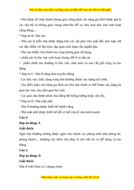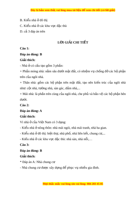 Đây là bản xem th , vu ử i lòng mua tài li u ệ đ xe ể m chi ti t ế (có l i ờ gi i ả ) B. Ki u nhà ể đô t ở hị C. Ki u nhà ể các khu v ở c ự đ c t ặ hù D. cả 3 đáp án trên L I Ờ GIẢI CHI TI T Ế Câu 1: Đáp án đúng: B Giải thích: - Nhà có c ở ấu t o g ạ m ồ 3 ph n: ầ + Ph n ầ móng nhà: n m ằ sâu dư i ớ m t ặ đ t ấ , có nhi m ệ v ụ ch ng ố đ ỡ các b ộ ph n ậ trên c a ủ ngôi nhà. + Thân nhà: g m ồ các bộ ph n ậ trên m t ặ đ t ấ , t o ạ nên ki n ế trúc c a ủ ngôi nhà nh : ư c t ộ nhà, tư ng ờ nhà, sàn gác, d m ầ nhà,... + Mái nhà: là ph n t ầ rên cùng c a ủ ngôi nhà, che ph và b ủ o ả v các b ệ ph ộ n ậ bên dư i ớ . Câu 2: Đáp án đúng: A Giải thích: Vì nhà c ở a ủ Vi t ệ Nam có 3 d ng: ạ - Ki u ể nhà nông t ở