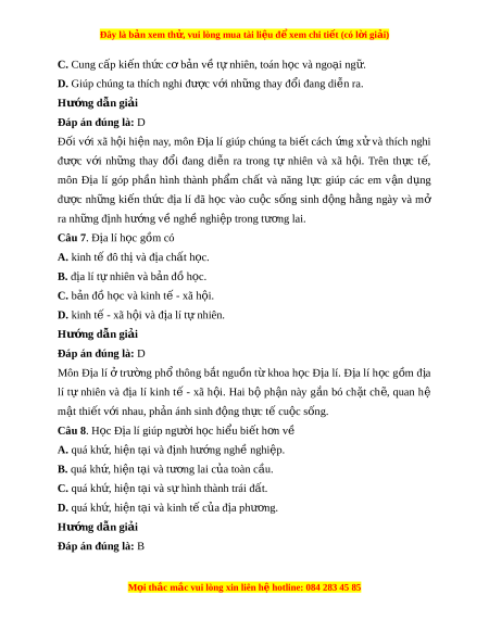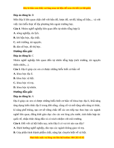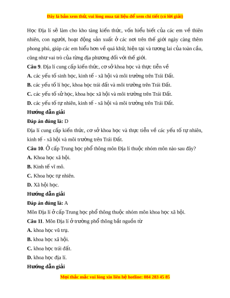 Câu 9. Địa lí cung cấp ki n t ế h c, ứ c s ơ ở khoa h c và t ọ h c ự ti n v ễ ề A. các y u t ế ố sinh h c, ki ọ nh t - ế xã h i ộ và môi trư ng t ờ rên Trái Đ t ấ . B. các y u t ế ố lí h c, khoa h ọ c ọ trái đ t ấ và môi trư ng t ờ rên Trái Đ t ấ . C. các y u t ế ố s h ử c, ọ khoa h c xã h ọ i ộ và môi trư ng t ờ rên Trái Đ t ấ . D. các y u t ế ố t nhi ự ên, kinh t - ế xã h i ộ và môi trư ng ờ trên Trái Đ t ấ . Hư ng d ớ ẫn gi i ả Đáp án đúng là: D Địa lí cung c p ấ ki n ế th c, ứ cơ sở khoa h c ọ và th c ự ti n ễ về các y u ế tố t ự nhiên, kinh t - ế xã h i ộ và môi trư ng t ờ rên Trái Đ t ấ .