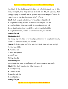 ễ ra trong tự nhiên và xã h i ộ . Trên th c ự t , ế môn Đ a ị lí góp ph n ầ hình thành ph m ẩ ch t ấ và năng l c ự giúp các em v n ậ d ng ụ đư c ợ nh ng ữ ki n ế th c ứ đ a ị lí đã h c ọ vào cu c ộ s ng ố sinh đ ng ộ h ng ằ ngày và mở ra nh ng đ ữ ịnh hư ng v ớ ề ngh nghi ề p t ệ rong tư ng l ơ ai. Câu 7. Địa lí h c ọ gồm có A. kinh t đô t ế h và đ ị a ch ị t ấ h c. ọ B. địa lí t nhi ự ên và b n đ ả ồ h c. ọ C. b n ả đồ h c ọ và kinh t - ế xã h i ộ . D. kinh t - ế xã h i ộ và đ a l ị í t nhi ự ên. Hư ng d ớ ẫn gi i ả Đáp án đúng là: D Môn Đ a ị lí ở trư ng ờ ph ổ thông b t ắ ngu n ồ t ừ khoa h c ọ Đ a ị lí. Đ a ị lí h c ọ g m ồ đ a ị lí tự nhiên và đ a ị lí kinh tế - xã h i ộ . Hai b ộ ph n ậ này g n ắ bó ch t ặ ch , ẽ quan hệ m t ậ thi t ế v i ớ nhau, ph n ánh ả sinh đ ng t ộ h c t ự ế cu c s ộ ng. ố Câu 8. H c ọ Địa lí giúp ngư i ờ h c hi ọ u bi ể t ế h n ơ về A. quá kh , ứ hiện t i ạ và định hư ng ngh ớ nghi ề p. ệ B. quá kh , hi ứ ện t i ạ và tư ng ơ lai c a t ủ oàn c u. ầ C. quá kh , ứ hiện t i