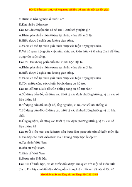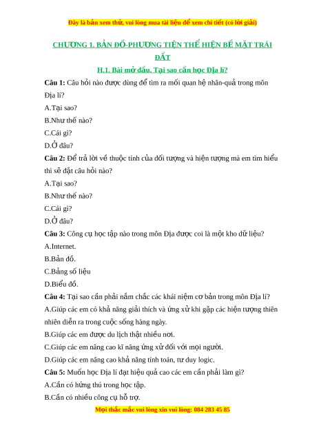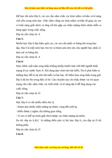 Đây là bản xem th , vu ử i lòng mua tài li u ệ đ xe ể m chi ti t ế (có l i ờ gi i ả ) Để h c ọ t t ố môn Đ a ị lí, các em c n ầ n m ắ ch c ắ các khái ni m ệ c ơ b n ả và kĩ năng chủ y u ế trong môn h c. ọ Vi c ệ n m ắ v ng ữ các khái ni m ệ c ơ b n ả s ẽ giúp các em có khả năng gi i ả thích và ng ứ xử khi g p ặ các hi n ệ tư ng ợ thiên nhiên di n ễ ra hàng ngày trong cu c s ộ ống. Đáp án cần ch n ọ là: A Câu 5: Muốn h c Đ ọ ịa lí đ t