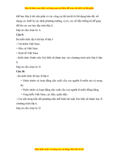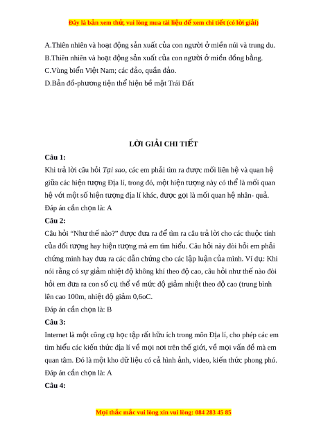 Đây là bản xem th , vu ử i lòng mua tài li u ệ đ xe ể m chi ti t ế (có l i ờ gi i ả ) A.Thiên nhiên và ho t ạ đ ng s ộ n xu ả t ấ c a con ủ ngư i ờ m ở i n núi ề và trung du. B.Thiên nhiên và ho t ạ đ ng s ộ n ả xu t ấ c a ủ con ngư i ờ m ở i n đ ề ng b ồ ng. ằ C.Vùng bi n ể Vi t ệ Nam; các đ o, qu ả n đ ầ o. ả D.B n ả đồ-phư ng t ơ i n t ệ h hi ể n b ệ m ề t ặ Trái Đ t ấ L I Ờ GIẢI CHI TI T Ế Câu 1: Khi trả l i ờ câu h i ỏ T i ạ sao, các em ph i ả tìm ra đư c m ợ i ố liên h và quan h ệ ệ gi a các ữ hi n t ệ ư ng ợ Đ a ị lí, trong đó, m t ộ hi n t ệ ư ng này có t ợ h l ể à m i ố quan hệ v i ớ m t ộ số hi n t ệ ư ng đ ợ a l ị í khác, đư c ợ g i ọ là m i ố quan h nhân ệ - qu . ả Đáp án cần ch n ọ là: A Câu 2: Câu h i ỏ “Nh t ư h nào?” ế đư c đ ợ a r ư a đ t ể ìm ra câu tr l ả i ờ cho các thu c t ộ ính c a đ ủ ối tư ng hay hi ợ ện tư ng m ợ à em tìm hi u. C ể âu h i ỏ này đòi h i ỏ em ph i ả ch ng m ứ inh hay đ a r ư a các d n ch ẫ ng ứ cho các l p ậ lu n c ậ a ủ mình. Ví d : ụ Khi nói r ng có s ằ ự gi m ả nhi t ệ đ không khí ộ theo đ cao, câu ộ h i ỏ nh t ư h nào đòi ế h i ỏ em đ a r ư a con số cụ th v ể m ề c đ ứ ộ gi m ả nhi t ệ theo đ cao ( ộ trung bình lên cao 100m, nhi t ệ đ gi ộ m ả 0,6oC. Đáp án cần ch n ọ là: B Câu 3: Internet là m t ộ công cụ h c t ọ p ậ r t ấ h u í ữ ch trong môn Đ a ị lí, cho phép các em tìm hi u ể các ki n t ế h c đ ứ a l ị í v m ề i ọ n i ơ trên th gi ế i ớ , v m ề i ọ v n đ ấ m ề à em quan tâm. Đó là m t ộ kho d l ữ i u có c ệ hì ả nh nh, vi ả deo, ki n t ế h c ứ phong phú. Đáp án cần ch n ọ là: A Câu 4: M i