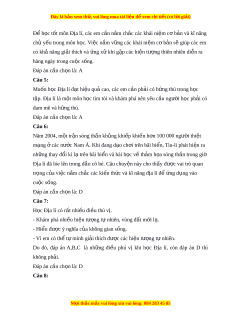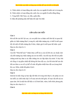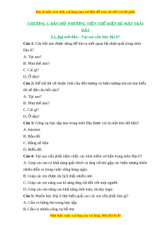 Đây là bản xem th , vu ử i lòng mua tài li u ệ đ xe ể m chi ti t ế (có l i ờ gi i ả ) A. Thiên nhiên và ho t ạ đ ng s ộ n xu ả t ấ c a con ủ ngư i ờ m ở i n núi ề và trung du. B. Thiên nhiên và ho t ạ đ ng s ộ n ả xu t ấ c a ủ con ngư i ờ m ở i n đ ề ng b ồ ng. ằ C. Vùng bi n ể Vi t ệ Nam; các đ o, qu ả n đ ầ o. ả D. B n ả đồ-phư ng t ơ i n t ệ h hi ể n b ệ m ề t ặ Trái Đ t ấ L I Ờ GIẢI CHI TI T Ế Câu 1: Khi trả l i ờ câu h i ỏ T i ạ sao, các em ph i ả tìm ra đư c m ợ i ố liên h và quan h ệ ệ gi a các ữ hi n t ệ ư ng ợ Đ a ị lí, trong đó, m t ộ hi n t ệ ư ng này có t ợ h l ể à m i ố quan hệ v i ớ m t ộ số hi n t ệ ư ng đ ợ a l ị í khác, đư c ợ g i ọ là m i ố quan h nhân ệ - qu . ả Đáp án cần ch n ọ là: A Câu 2: Câu h i ỏ “Nh t ư h nào?” ế đư c đ ợ a r ư a đ t ể ìm ra câu tr l ả i ờ cho các thu c t ộ ính c a đ ủ ối tư ng hay hi ợ ện tư ng m ợ à em tìm hi u. C ể âu h i ỏ này đòi h i ỏ em ph i ả ch ng m ứ inh hay đ a r ư a các d n ch ẫ ng ứ cho các l p ậ lu n c ậ a ủ mình. Ví d : ụ Khi nói r ng có s ằ ự gi m ả nhi t ệ đ không khí ộ theo đ cao, câu ộ h i ỏ nh t ư h nào đòi ế h i ỏ em đ a r ư a con số cụ th v ể m ề c đ ứ ộ gi m ả nhi t ệ theo đ cao ( ộ trung bình lên cao 100m, nhi t ệ đ gi ộ m ả 0,6oC. Đáp án cần ch n ọ là: B Câu 3: Internet là m t ộ công cụ h c t ọ p ậ r t ấ h u í ữ ch trong môn Đ a ị lí, cho phép các em tìm hi u ể các ki n t ế h c đ ứ a l ị í v m ề i ọ n i ơ trên th gi ế i ớ , v m ề i ọ v n đ ấ m ề à em quan tâm. Đó là m t ộ kho d l ữ i u có c ệ hì ả nh nh, vi ả deo, ki n t ế h c ứ phong phú. Đáp án cần ch n ọ là: A Câu 4: M i