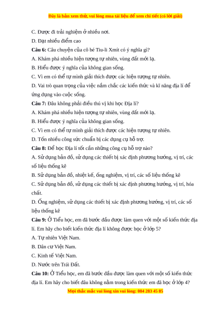 Câu 7: Đâu không ph i ả đi u t ề hú v khi ị h c Đ ọ a l ị í? A. Khám phá nhi u hi ề n t ệ ư ng t ợ nhi ự ên, vùng đ t ấ m i ớ l . ạ B. Hi u đ ể ược ý nghĩa c a ủ không gian sống. C. Vì em có thể t m ự ình gi i ả thích đư c các ợ hi n t ệ ư ng t ợ nhi ự ên. D. Tốn nhi u công s ề ức chuẩn bị các d ng c ụ ụ hỗ tr . ợ Câu 8: Để h c Đ ọ