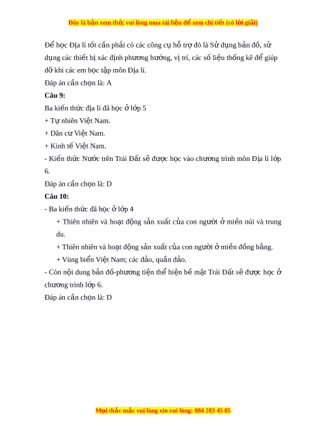 D. Ống nghiệm, sử d ng các ụ thi t ế b xác ị đ nh ph ị ư ng ơ hư ng, v ớ t ị rí, các s ố li u t ệ hống kê Câu 9: Ở Ti u h ể c, ọ em đã bư c đ ớ ầu đư c ợ làm quen v i ớ m t ộ số ki n t ế h c ứ đ a ị lí. Em hãy cho bi t ế ki n t ế h c ứ đ a ị lí không đư c h ợ c ọ l ở p 5? ớ A. T nhi ự ên Vi t ệ Nam. B. Dân c ư Vi t ệ Nam. C. Kinh t ế Vi t ệ Nam. D. Nư c t ớ rên Trái Đ t ấ . Câu 10: Ở Ti u h ể c, ọ em đã bư c đ ớ ầu đư c ợ làm quen v i ớ m t ộ số ki n t ế h c ứ địa lí. Em hãy cho bi t ế đâu không n m ằ trong ki n t ế h c ứ em đã h c ọ l ở p 4? ớ M i