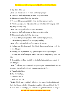 Đây là bản xem th , vu ử i lòng mua tài li u ệ đ xe ể m chi ti t ế (có l i ờ gi i ả ) Chư ng ơ I. B n đ ả ph ồ ư ng t ơ i n t ệ h hi ể n b ệ m ề t ặ trái đ t ấ F1. Bài m đ ở ầu Câu 1: Câu h i ỏ nào đư c ợ dùng đ t ể ìm ra m i ố quan h nhân- ệ qu t ả rong môn Địa lí? A. T i ạ sao? B. Như thế nào? C. Cái gì? D. Ở đâu? Câu 2: Đ t ể r l ả i ờ v t ề hu c t ộ ính c a đ ủ ối tư ng và hi ợ n t ệ ư ng ợ mà em tìm hi u ể thì sẽ đ t ặ câu h i ỏ nào? A. T i ạ sao? B. Như thế nào? C. Cái gì? D. Ở đâu? Câu 3: Công c h ụ c t ọ p ậ nào trong môn Đ a đ ị ược coi là m t ộ kho d l ữ i u? ệ A. Internet. B. B n đ ả ồ. C. B ng s ả ố li u ệ D. Bi u đ ể ồ. Câu 4: T i ạ sao c n ph ầ i ả n m ắ ch c các ắ khái ni m ệ c b ơ n ả trong môn Đ a l ị í?