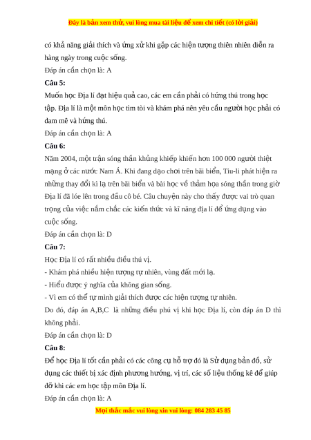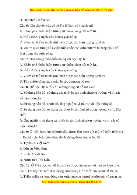 Đây là bản xem th , vu ử i lòng mua tài li u ệ đ xe ể m chi ti t ế (có l i ờ gi i ả ) có kh năng ả gi i ả thích và ng x ứ khi ử g p ặ các hi n t ệ ư ng t ợ hiên nhiên di n ễ ra hàng ngày trong cu c s ộ ống. Đáp án cần ch n ọ là: A Câu 5: Muốn h c Đ ọ ịa lí đ t