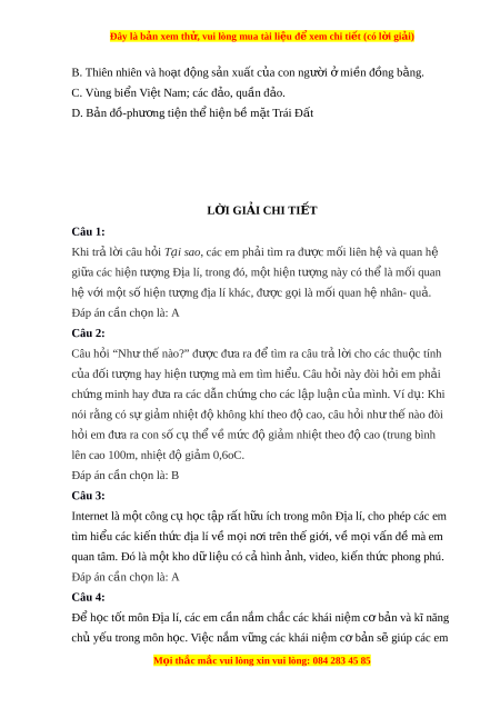 Đây là bản xem th , vu ử i lòng mua tài li u ệ đ xe ể m chi ti t ế (có l i ờ gi i ả ) B. Thiên nhiên và ho t ạ đ ng s ộ n ả xu t ấ c a ủ con ngư i ờ m ở i n đ ề ng b ồ ng. ằ C. Vùng bi n ể Vi t ệ Nam; các đ o, qu ả n đ ầ o. ả D. B n ả đồ-phư ng t ơ i n t ệ h hi ể n b ệ m ề t ặ Trái Đ t ấ L I Ờ GIẢI CHI TI T Ế Câu 1: Khi trả l i ờ câu h i ỏ T i ạ sao, các em ph i ả tìm ra đư c m ợ i ố liên h và quan h ệ ệ gi a các ữ hi n t ệ ư ng ợ Đ a ị lí, trong đó, m t ộ hi n t ệ ư ng này có t ợ h l ể à m i ố quan hệ v i ớ m t ộ số hi n t ệ ư ng đ ợ a l ị í khác, đư c ợ g i ọ là m i ố quan h nhân ệ - qu . ả Đáp án cần ch n ọ là: A Câu 2: Câu h i ỏ “Nh t ư h nào?” ế đư c đ ợ a r ư a đ t ể ìm ra câu tr l ả i ờ cho các thu c t ộ ính c a đ ủ ối tư ng hay hi ợ ện tư ng m ợ à em tìm hi u. C ể âu h i ỏ này đòi h i ỏ em ph i ả ch ng m ứ inh hay đ a r ư a các d n ch ẫ ng ứ cho các l p ậ lu n c ậ a ủ mình. Ví d : ụ Khi nói r ng có s ằ ự gi m ả nhi t ệ đ không khí ộ theo đ cao, câu ộ h i ỏ nh t ư h nào đòi ế h i ỏ em đ a r ư a con số cụ th v ể m ề c đ ứ ộ gi m ả nhi t ệ theo đ cao ( ộ trung bình lên cao 100m, nhi t ệ đ gi ộ m ả 0,6oC. Đáp án cần ch n ọ là: B Câu 3: Internet là m t ộ công cụ h c t ọ p ậ r t ấ h u í ữ ch trong môn Đ a ị lí, cho phép các em tìm hi u ể các ki n t ế h c đ ứ a l ị í v m ề i ọ n i ơ trên th gi ế i ớ , v m ề i ọ v n đ ấ m ề à em quan tâm. Đó là m t ộ kho d l ữ i u có c ệ hì ả nh nh, vi ả deo, ki n t ế h c ứ phong phú. Đáp án cần ch n ọ là: A Câu 4: Đ h ể c t