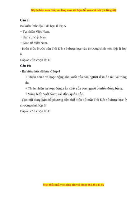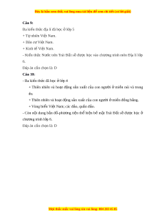 D. Ống nghiệm, sử d ng các ụ thi t ế b xác ị đ nh ph ị ư ng ơ hư ng, v ớ t ị rí, các s ố li u t ệ hống kê Câu 9: Ở Ti u h ể c, ọ em đã bư c đ ớ ầu đư c ợ làm quen v i ớ m t ộ số ki n t ế h c ứ đ a ị lí. Em hãy cho bi t ế ki n t ế h c ứ đ a ị lí không đư c h ợ c ọ l ở p 5? ớ A. T nhi ự ên Vi t ệ Nam. B. Dân c ư Vi t ệ Nam. C. Kinh t ế Vi t ệ Nam. D. Nư c t ớ rên Trái Đ t ấ . Câu 10: Ở Ti u h ể c, ọ em đã bư c đ ớ ầu đư c ợ làm quen v i ớ m t ộ số ki n t ế h c ứ địa lí. Em hãy cho bi t ế đâu không n m ằ trong ki n t ế h c ứ em đã h c ọ l ở p 4? ớ A. Thiên nhiên và ho t ạ đ ng s ộ n xu ả t ấ c a con ủ ngư i ờ m ở i n núi ề và trung du. M i