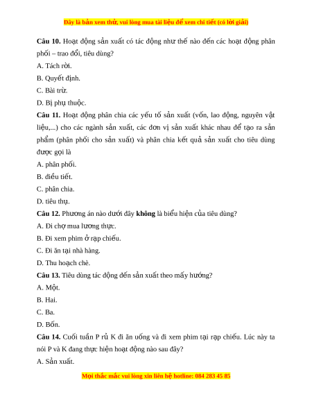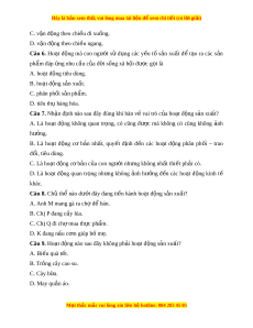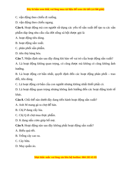 Đây là bản xem th , vu ử i lòng mua tài li u ệ đ xe ể m chi ti t (c ế ó l i ờ gi i ả ) C. v n đ ậ ng t ộ heo chi u đi ề xu ng. ố D. v n ậ đ ng t ộ heo chi u ngang. ề Câu 6. Ho t ạ đ ng ộ mà con ngư i ờ s ử d ng ụ các y u ế t ố s n ả xu t ấ đ ể t o ạ ra các s n ả phẩm đáp ng nhu c ứ u c ầ a ủ đ i ờ s ng xã h ố i ộ đư c ợ g i ọ là A. ho t ạ đ ng t ộ iêu dùng. B. ho t ạ đ ng s ộ n xu ả t ấ . C. phân ph i ố s n ph ả m ẩ . D. tiêu th hàng ụ hóa. Câu 7. Nh n ậ đ nh nào s ị au đây đúng khi bàn v vai ề trò c a ủ ho t ạ đ ng ộ s n ả xu t ấ ? A. Là ho t ạ đ ng ộ không quan tr ng, ọ có cũng đư c